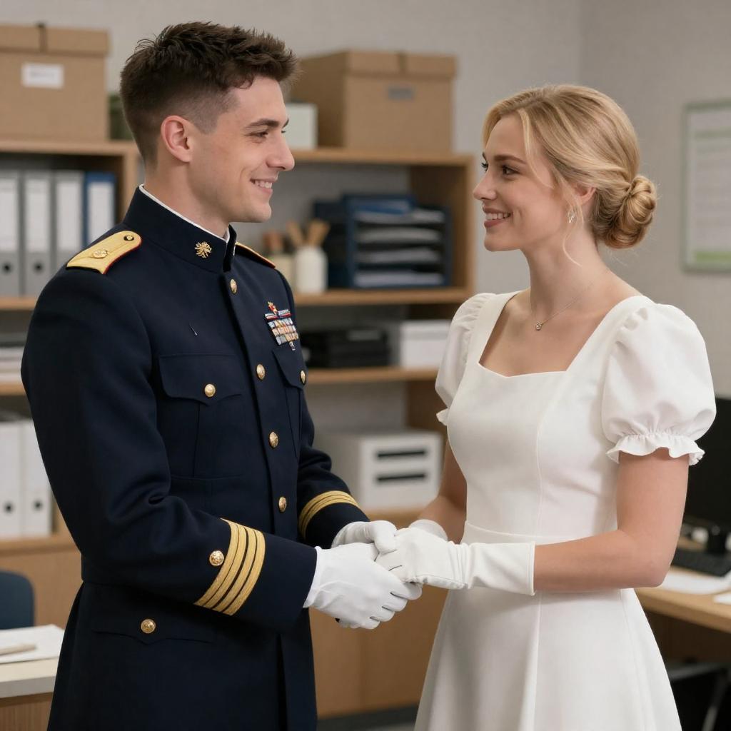 Man in red military-style coat with gold trim and blue sash, holding hands with blonde woman in blue off-the-shoulder dress. Background: woman in pink dress, Christmas tree, man in black suit. Woman in pink looking to side, man in black partially visible. Woman in blue smiling at man in red. Christmas decorations. Man in red holding paper. Indoor setting.