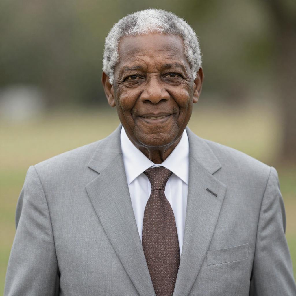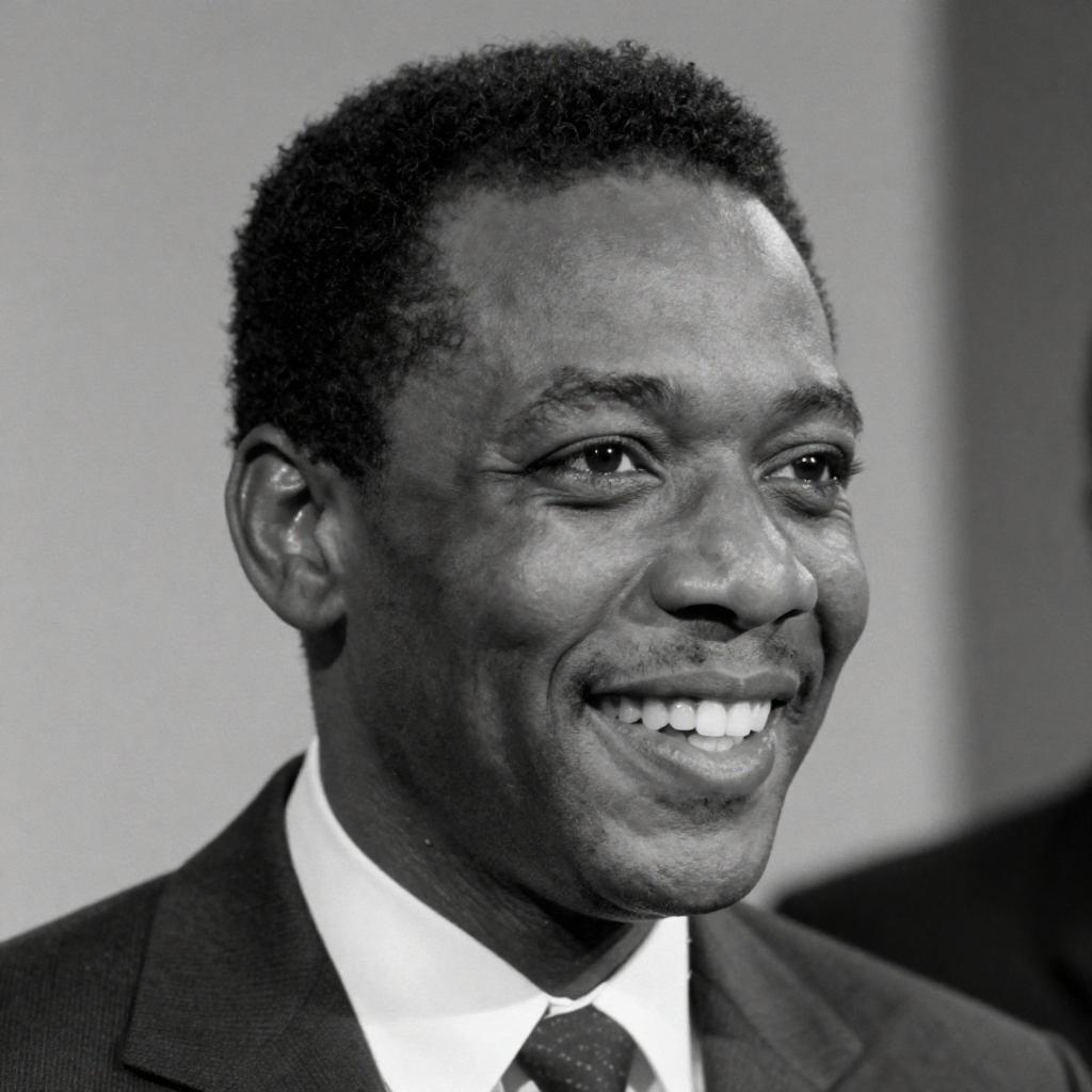 Black-and-white photograph of a smiling African-American man with short, curly hair, wearing a dark suit and white shirt. He looks slightly to the right, showing his teeth. The background is blurred, focusing attention on his face. The image has a high-contrast, grainy ure.
