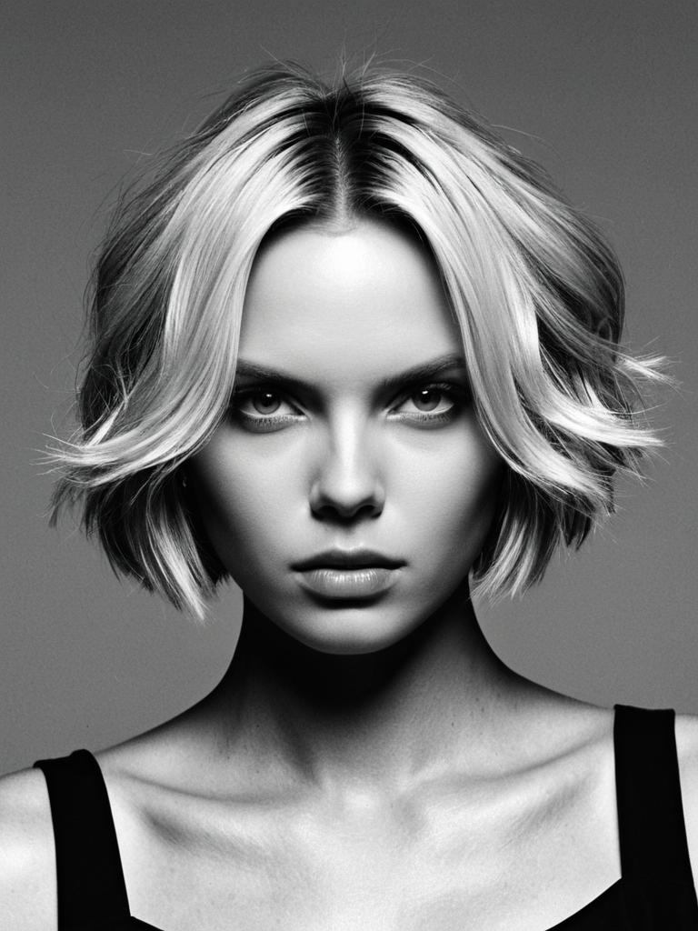 Woman with Charlize Theron Bob Hairstyle, photorealistic detailed editorial photo