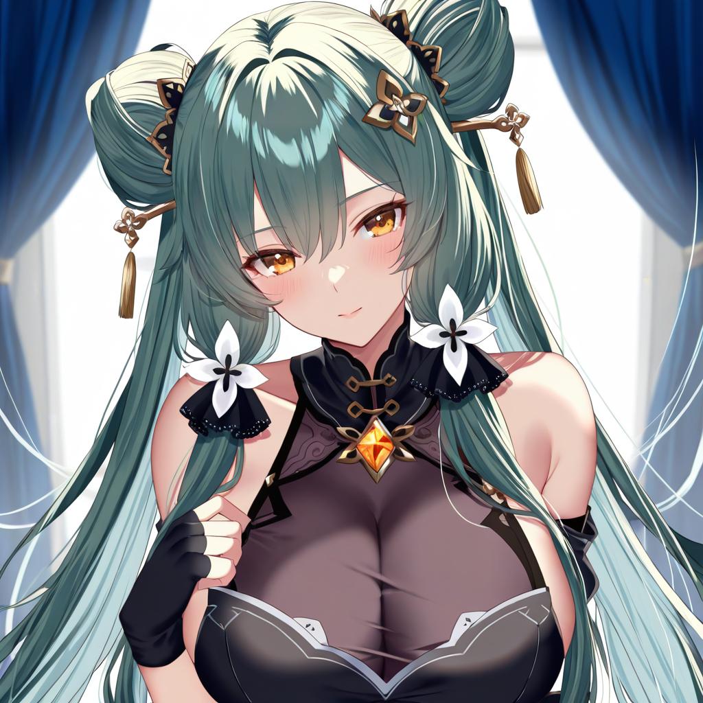 Close-up portrait of an anime girl with long green hair styled in twin buns adorned with ornamental hairpins. She has orange eyes with a gentle, smiling expression, rosy cheeks, and is dressed in a black, elegant outfit featuring bare shoulders and fingerless gloves. Background shows blurred blue curtains with bright light filtering through.
