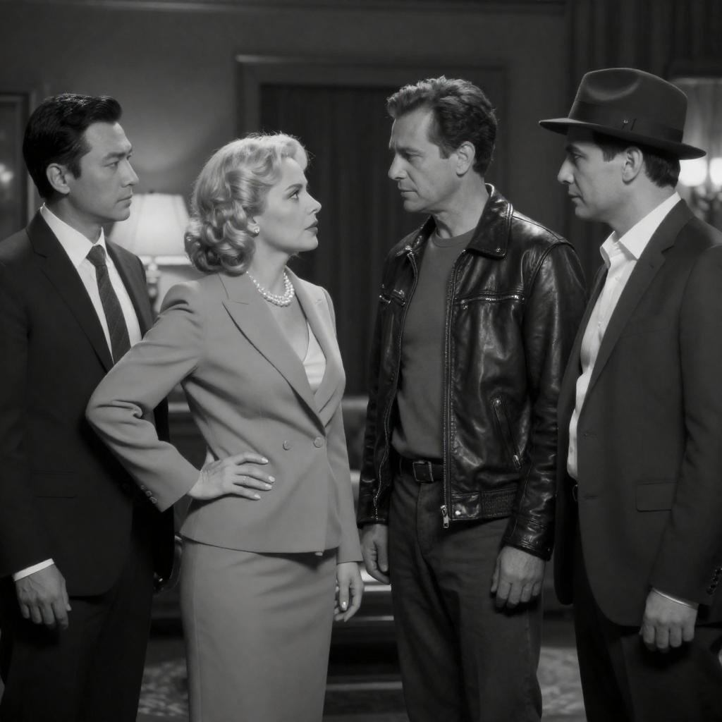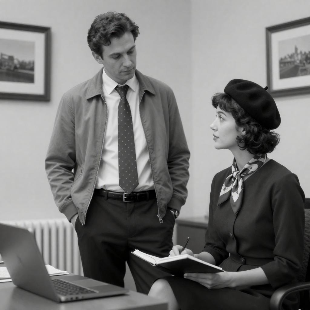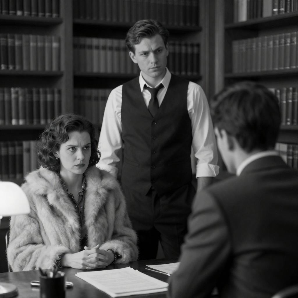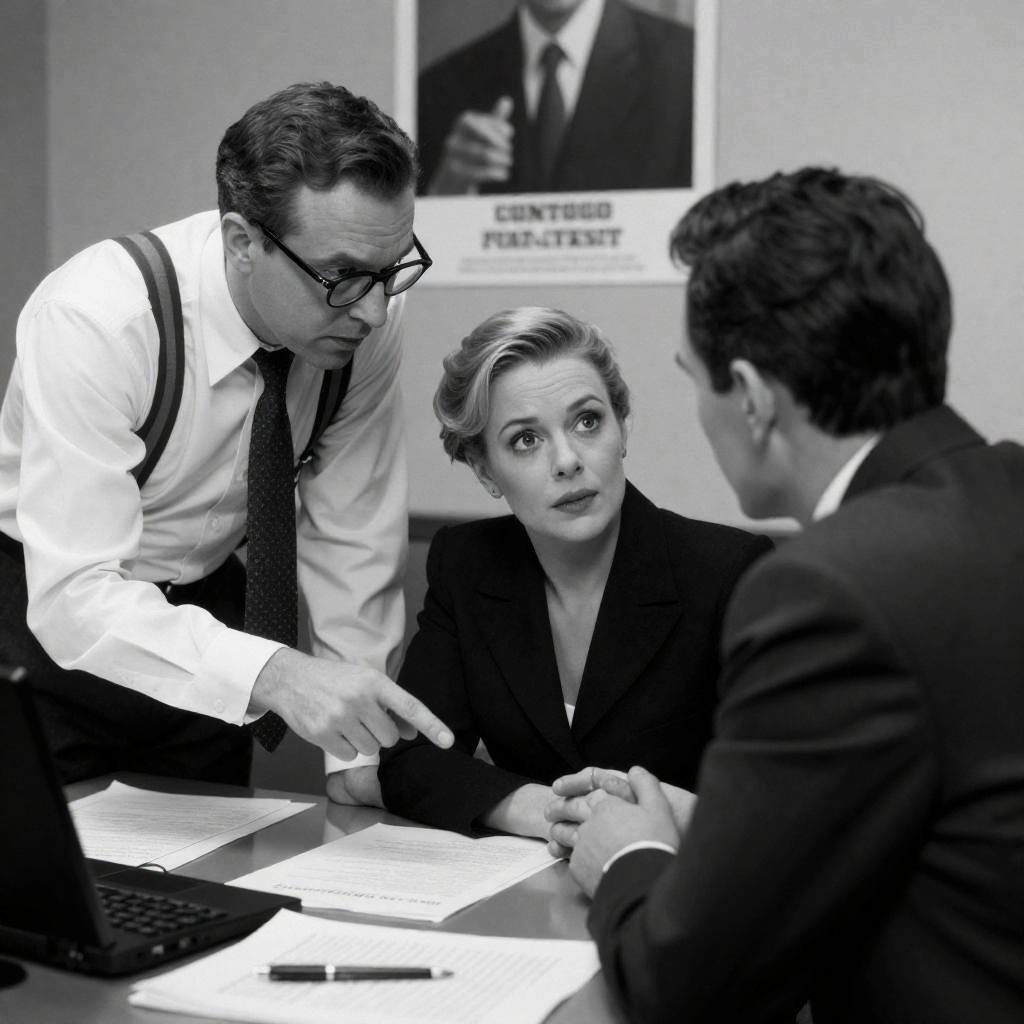 Black-and-white photograph of three people at a desk. A man with glasses and suspenders leans forward, pointing at a document. A woman with blonde hair in an updo looks up at him. Another man in a dark suit faces the woman. Desk with papers and a pen. Background has a poster. Intense expressions on the woman's face.