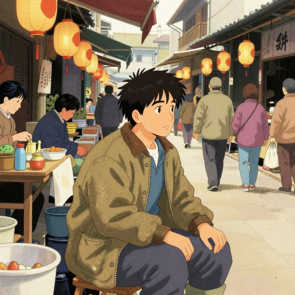 A humble street vendor, wearing a worn cotton jacket, sitting in a crowded marketplace alley, surrounded by hanging lanterns and bustling shoppers, illustrated in the nostalgic and atmospheric manga style of Tadao Tsuge.