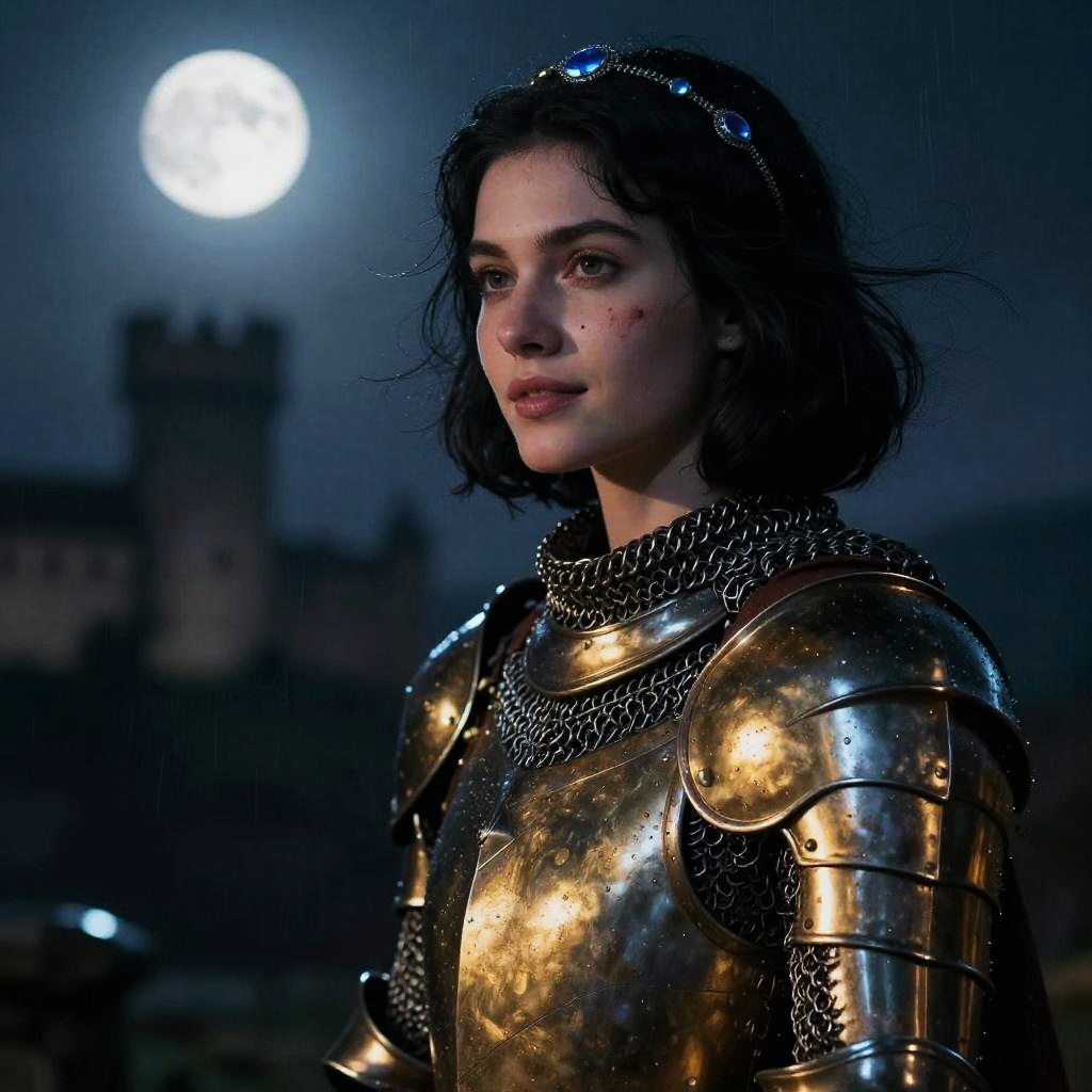 Portrait of a young woman with black bobbed hair wearing intricate medieval gold armor and chainmail, standing outdoors at night under intense moonlight. A castle is visible in the blurred background, adding to the dramatic and cinematic atmosphere. The image features sharp focus on the subject with metallic reflections on the armor, creating a striking and realistic medieval scene.