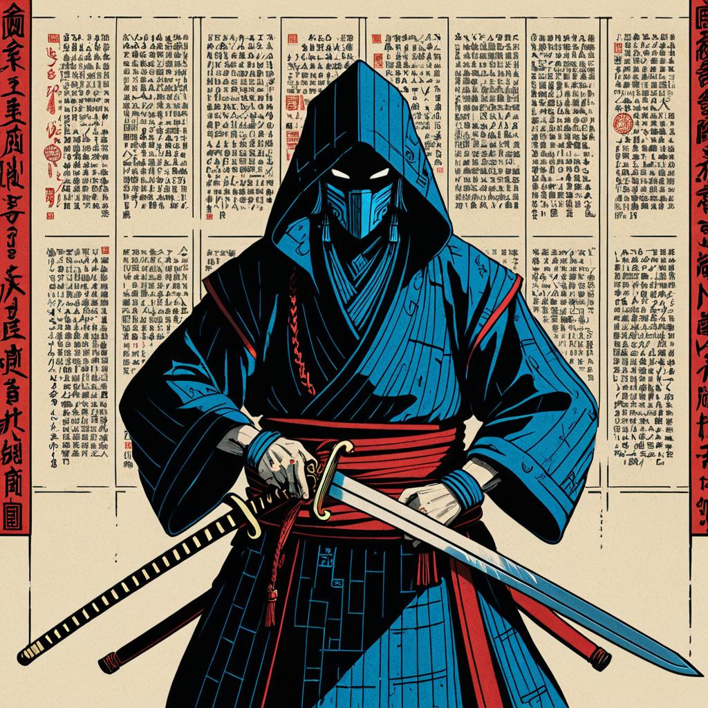 Illustration in ukiyo-e style depicting a shadowy rogue wearing a hood and mask, dressed in black and electric blue robes with crimson accents. The figure is holding traditional Japanese swords with a backdrop of ancient and digital encrypted scrolls, blending traditional and cyberpunk aesthetics. The image features dynamic action and intricate details, emphasizing a fusion dojo setting with a parchment beige background.