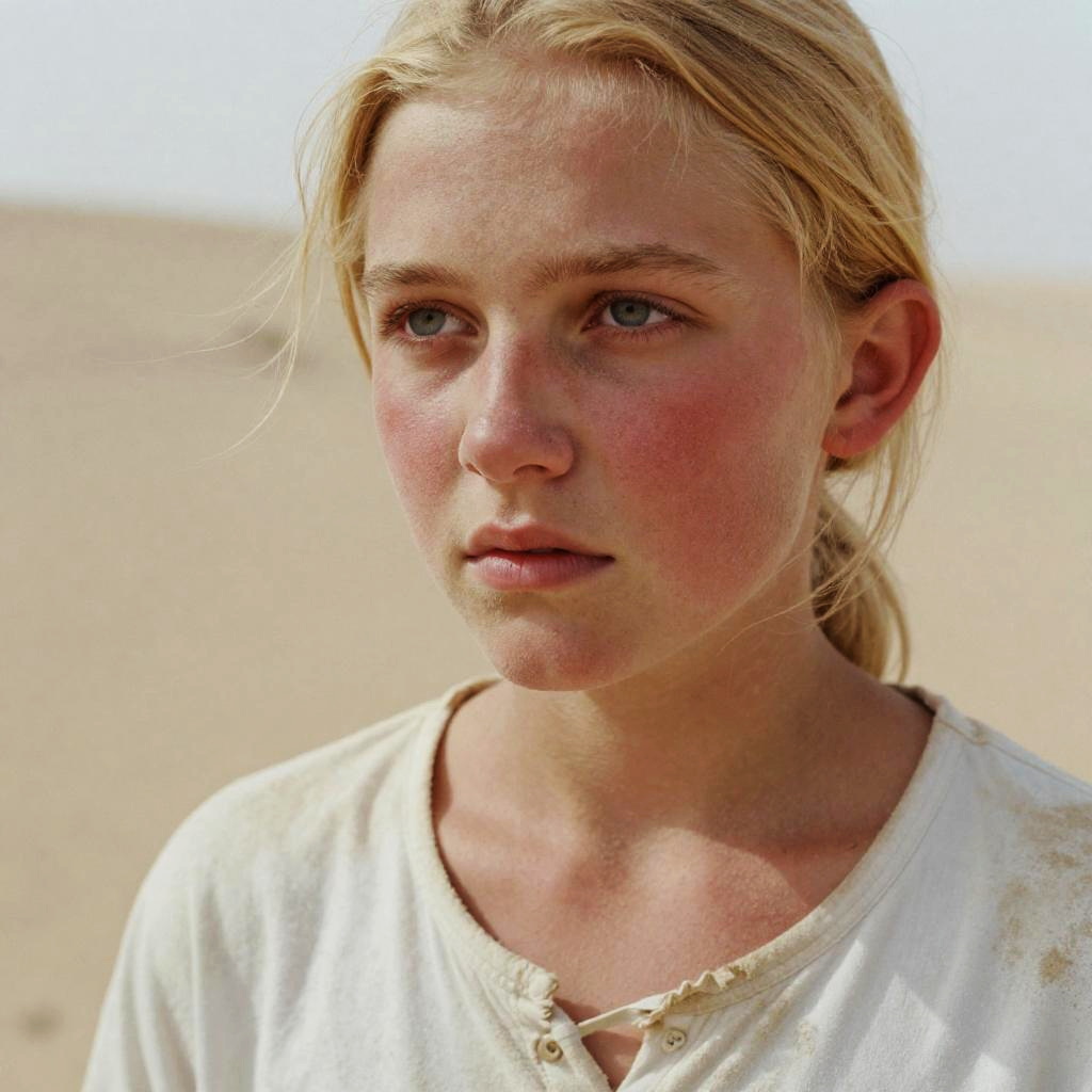 RAW candid upper body photo, blonde (woman), ((age:12 years old)), wearing an old dirty white shirt, rags, lost in the desert, detailed skin texture, (blush:0.5), (goosebumps:0.5), color graded portra 400 film, remarkable color, ultra realistic, textured skin, remarkable detailed pupils, realistic dull skin noise, visible skin detail, skin fuzz, dry skin