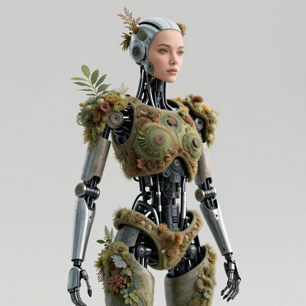 A bionic woman robot adorned with botanical elements, featuring intricate detailing and a mix of organic and mechanical components.