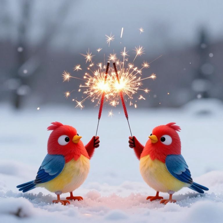 Two anthropomorphic birds stand on a snowy landscape, holding red sparklers that ignite a dazzling display of golden sparks as they celebrate amidst a serene winter backdrop.