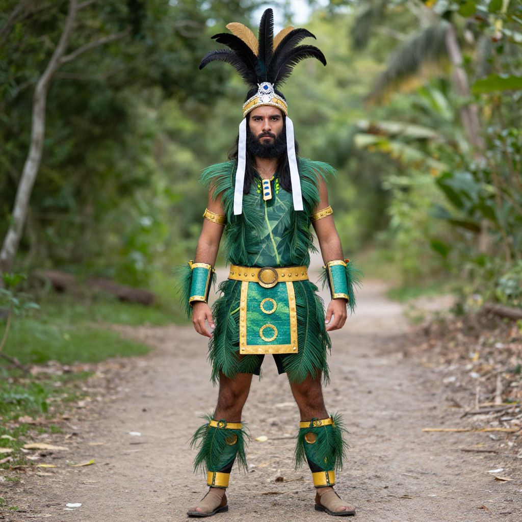 "Jungle Man Costume, man with a beard and a feather headdress standing on a path"