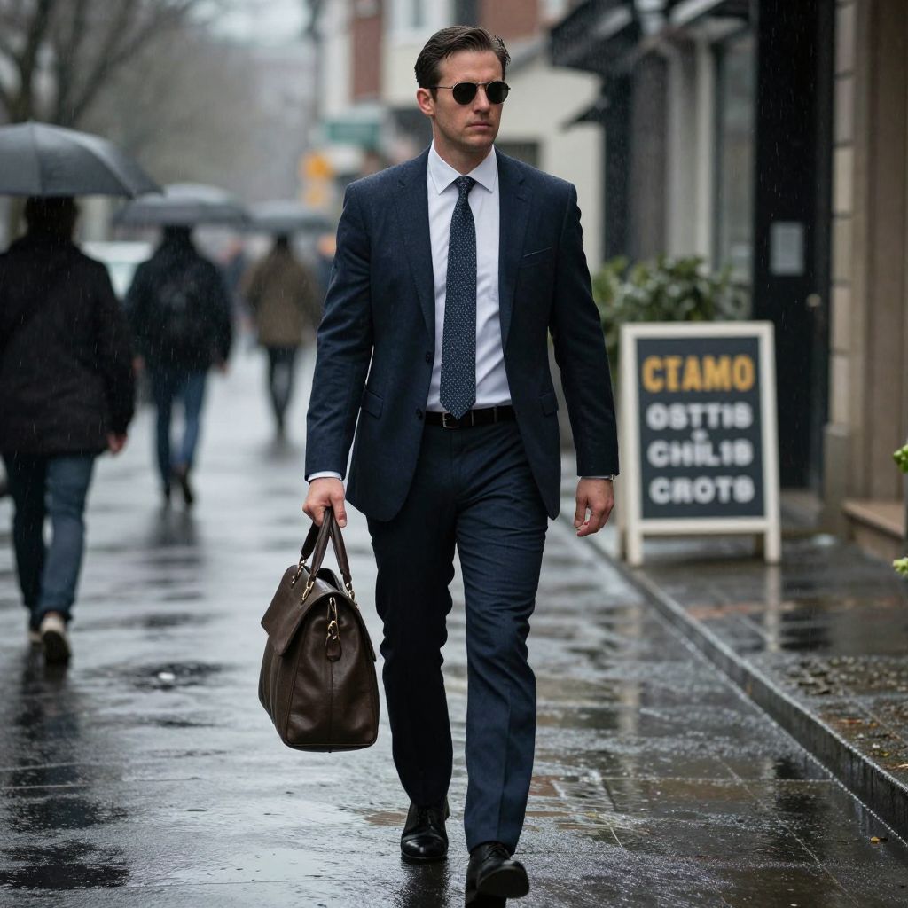 A stylish businessman in a rain-soaked street, dressed in a sharp suit and tie, carries a bag over his shoulder, with a sign in the background and a dramatic, cinematic mood.