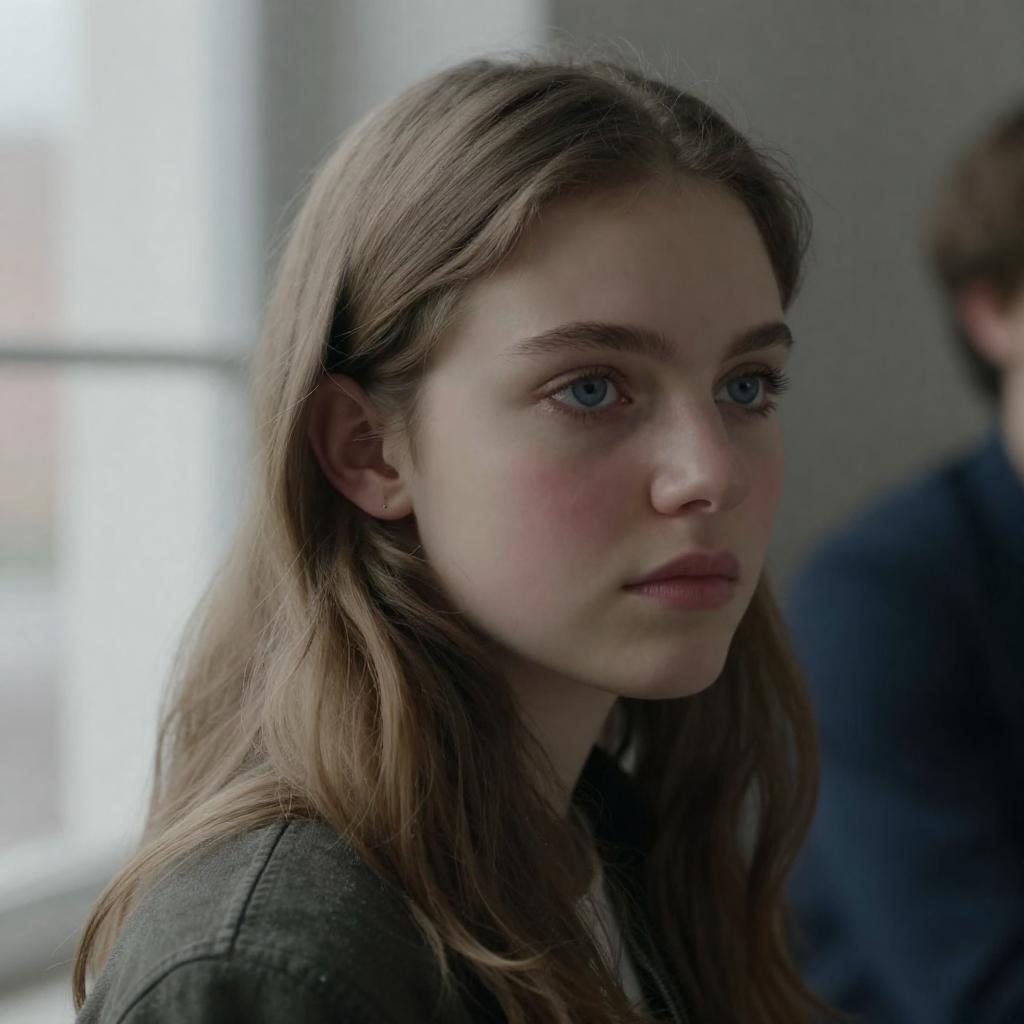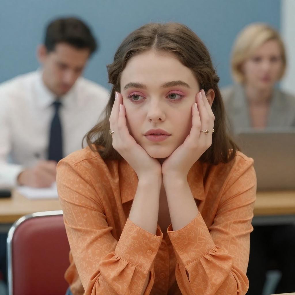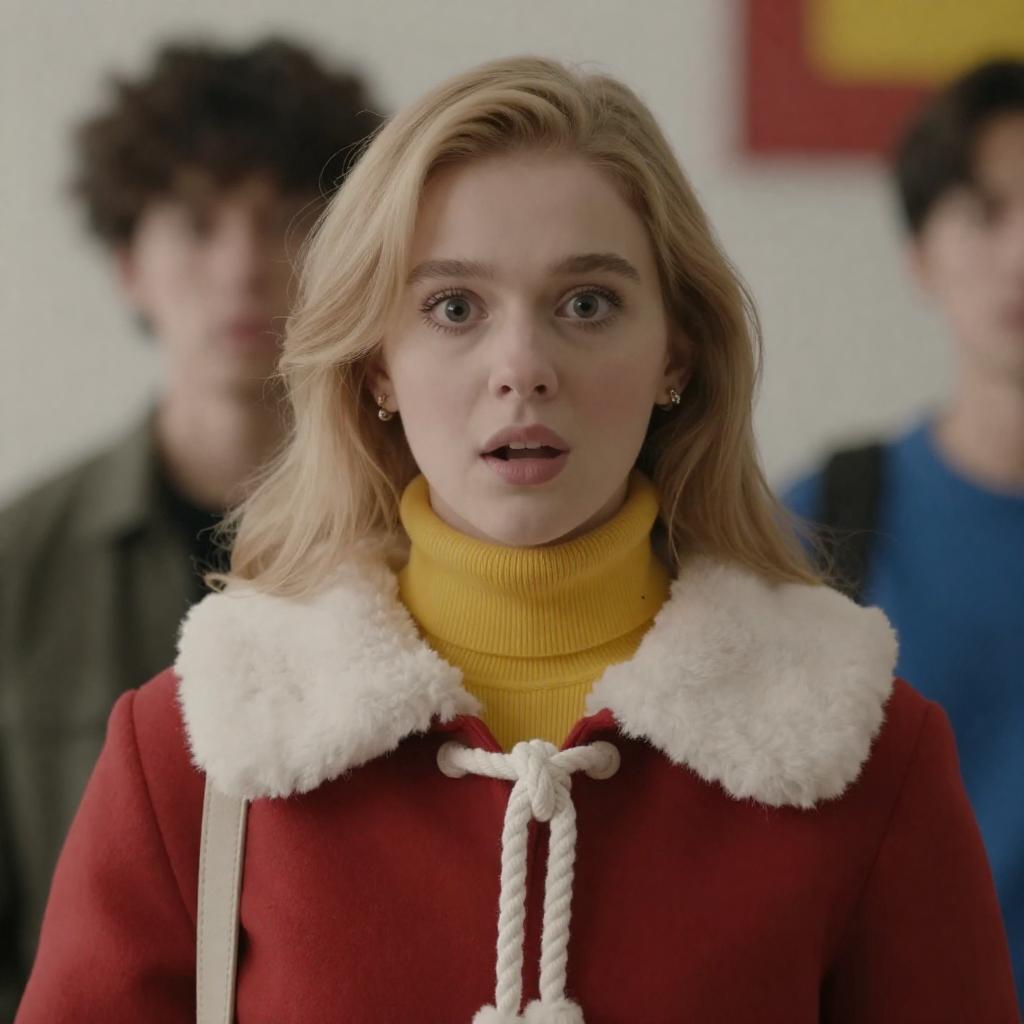 Young woman with blonde hair, surprised expression, red coat with white fur trim, yellow turtleneck, white rope tie. Background: blurred people, one with curly hair, another in blue shirt, and red and yellow object. Indoor setting.
