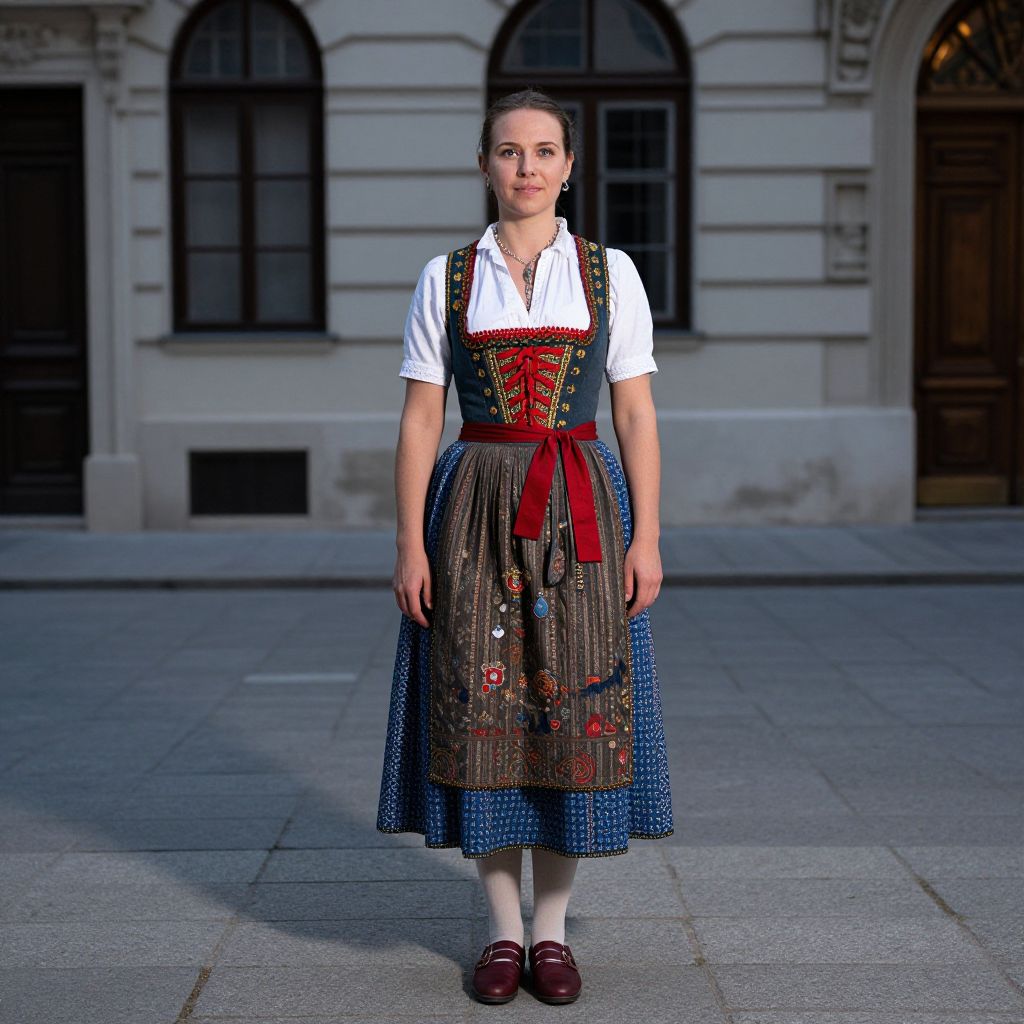 Invisibility realistic full-body portrait of Austrian woman with traditional Austrian clothing lives in Vienna, kodak portra, 8k, f2.8, evening lighting,