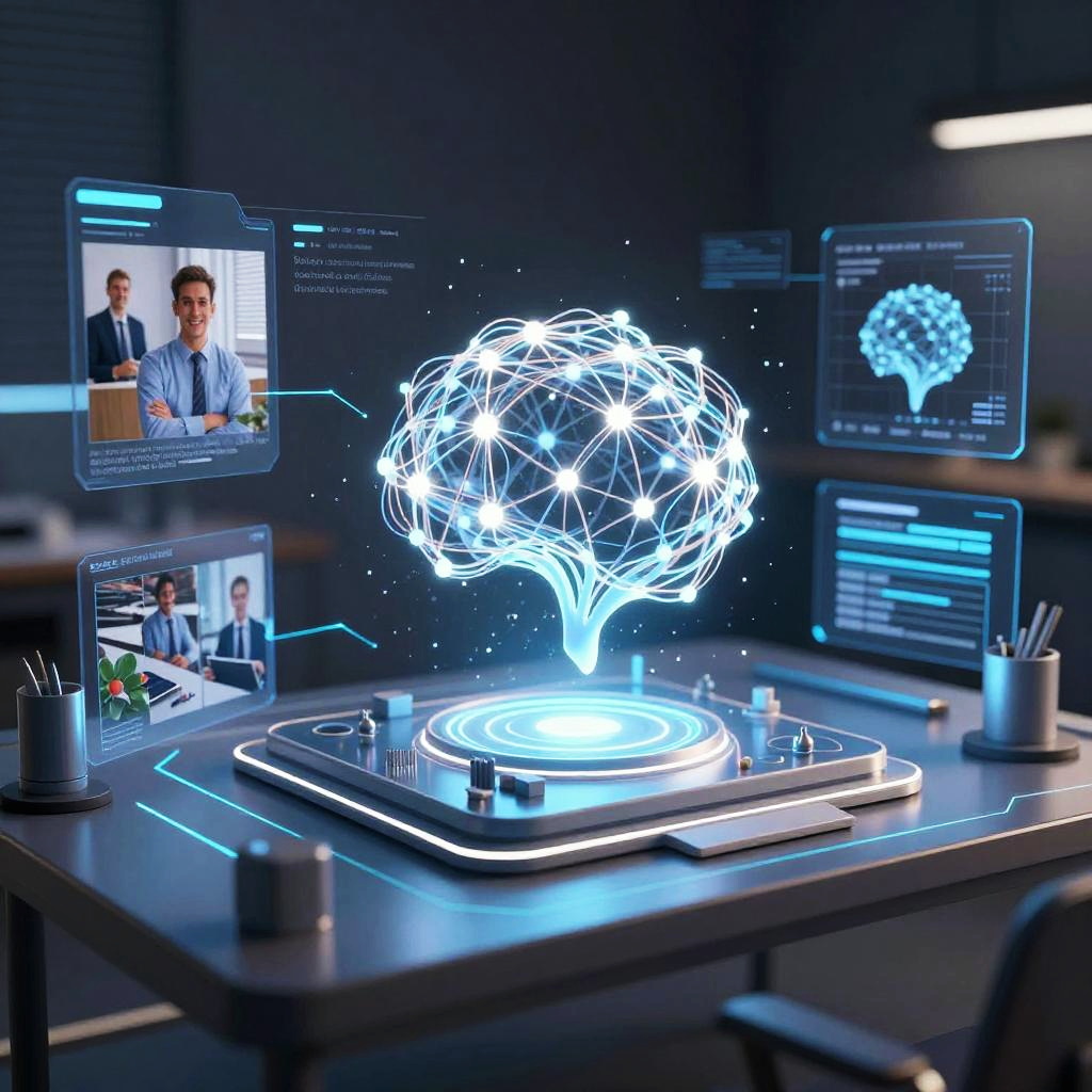 High-tech visualization of image to 3D AI technology, featuring a digital interface transforming flat pictures into realistic three-dimensional objects, glowing neural networks, and a sleek virtual workspace with floating data and laser lines.