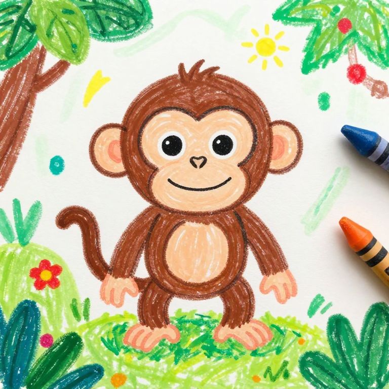 Monkeydrawing of a cute baby monkey using crayons to create a bright, cheerful picture on a sheet of paper, with playful splashes of color and an imaginative jungle background.