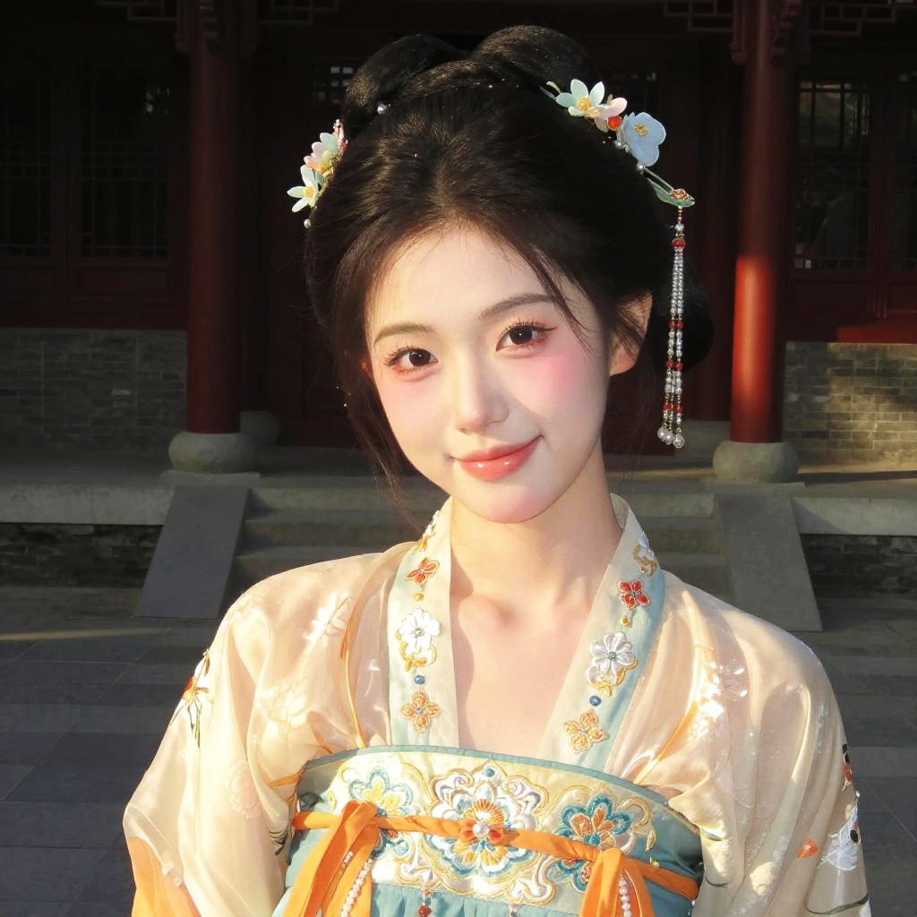 Realistic, 1girl, makeup, chinese girl, parted lips, blush, (hanfu:1.2), light smile, east asian architecture, sun, sunlight, reflection, hair ornament