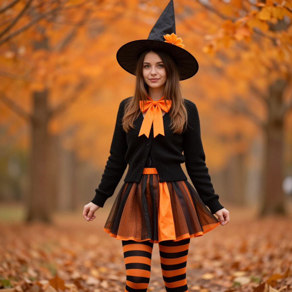 A young woman dressed in a vibrant Halloween witch costume, featuring a black witch hat adorned with an orange flower, a black cardigan with an orange bow, and a pleated skirt in orange and black tones. She completes the look with matching orange and black striped pantyhose, standing outdoors in an autumnal setting with orange foliage and fallen leaves.
