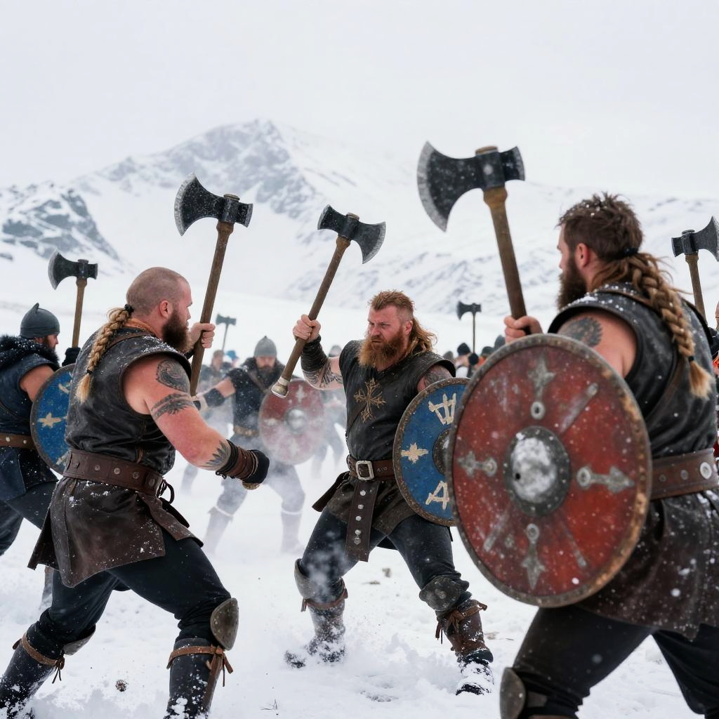 Strongman Iceland Vikings engaged in fierce battle amid snow-covered mountains, wielding large axes and shields, steam rising from their breath in cold air, detailed braided hair and tattoos, epic and intense atmosphere under overcast skies.
