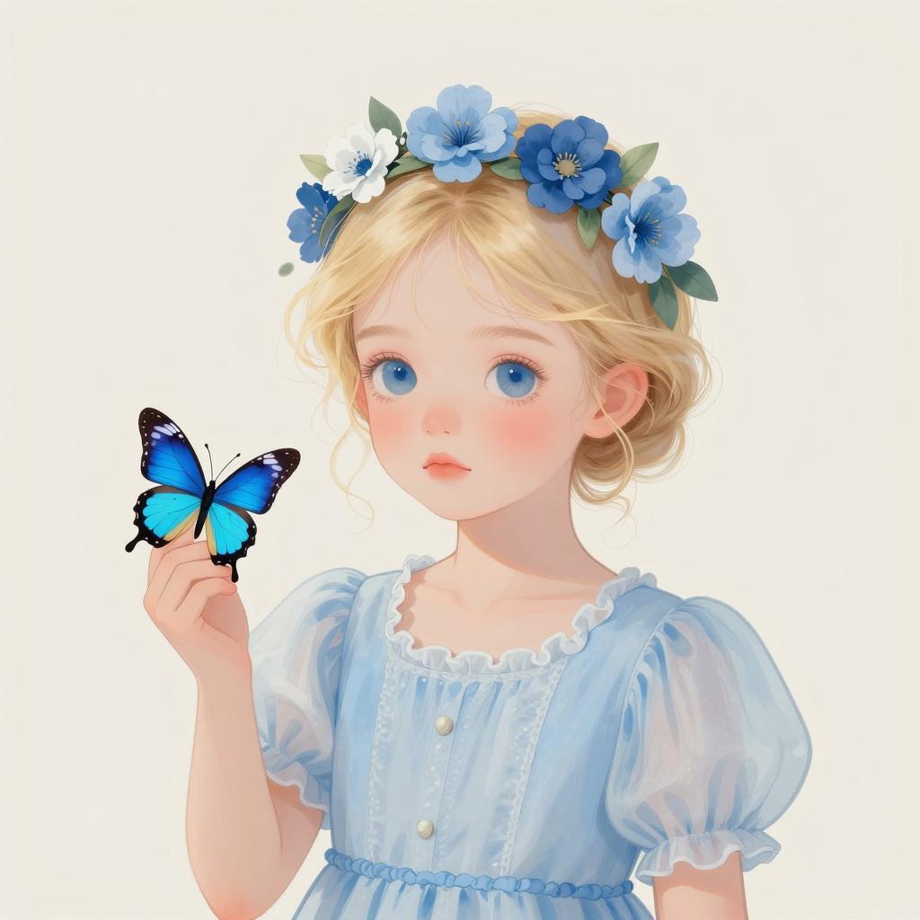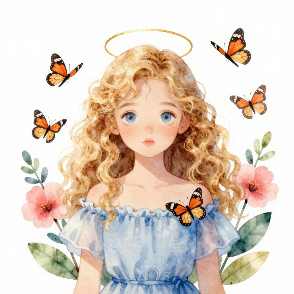 Illustration of a young girl with curly blonde hair, blue eyes, and fair skin. She wears a blue off-shoulder dress, surrounded by pink flowers, green leaves, and orange butterflies. Golden halo-like rings frame her head. Her expression is neutral. Multiple butterflies fly around her head and shoulders. Delicate, watercolor-style art.