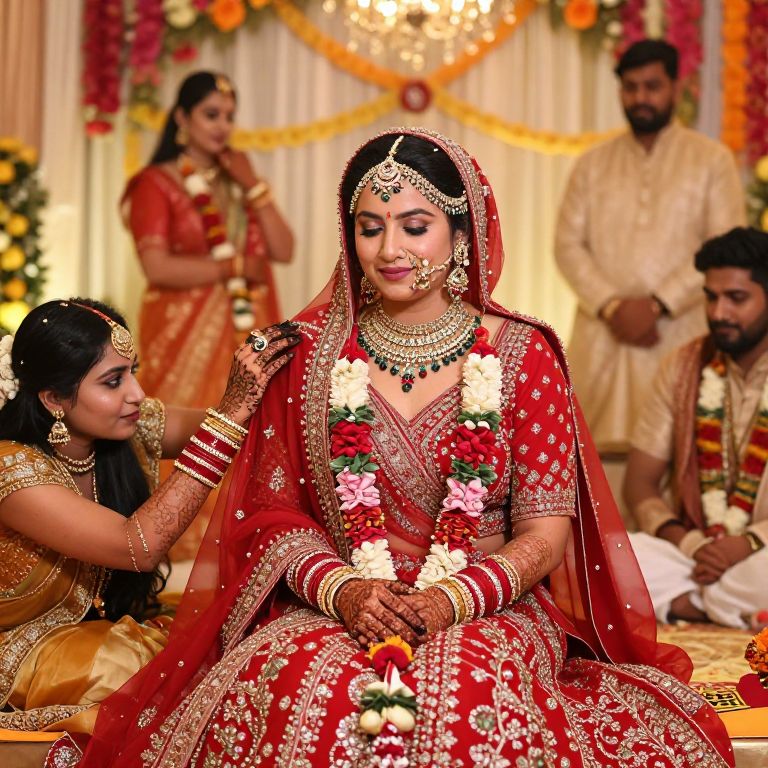 Indian bride images capturing the moment of a bride wearing a stunning red bridal outfit with detailed zari work, elaborate jewelry, and floral garlands, surrounded by festive wedding celebrations, henna artists, and traditional rituals in a grand ceremony hall.