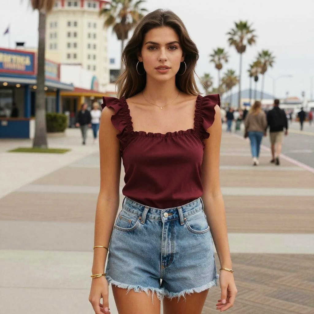 A slim woman in casual streetwear, wearing a cream short-sleeve t-shirt and frayed white denim shorts, stands at a fashionable boardwalk in South Beach. She has minimal makeup and a natural wavy hairstyle, embodying the visual style of hakusensha. Sexy. Pretty face and beutiful eyes