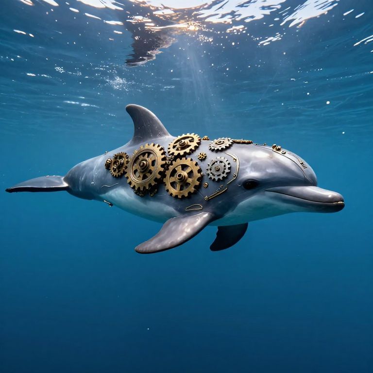 A steampunk-inspired dolphin adorned with intricate mechanical gears and cogs glides gracefully through the ocean, its metallic body reflecting the sunlit sky above, defying the boundaries between nature and machinery.