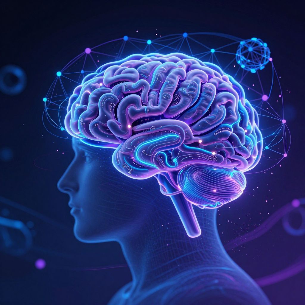 Abstract mindmap illustration merging human brain elements and network nodes, vibrant electric blues and purples, surreal sci-fi environment with floating particles and light trails, high resolution and immersive