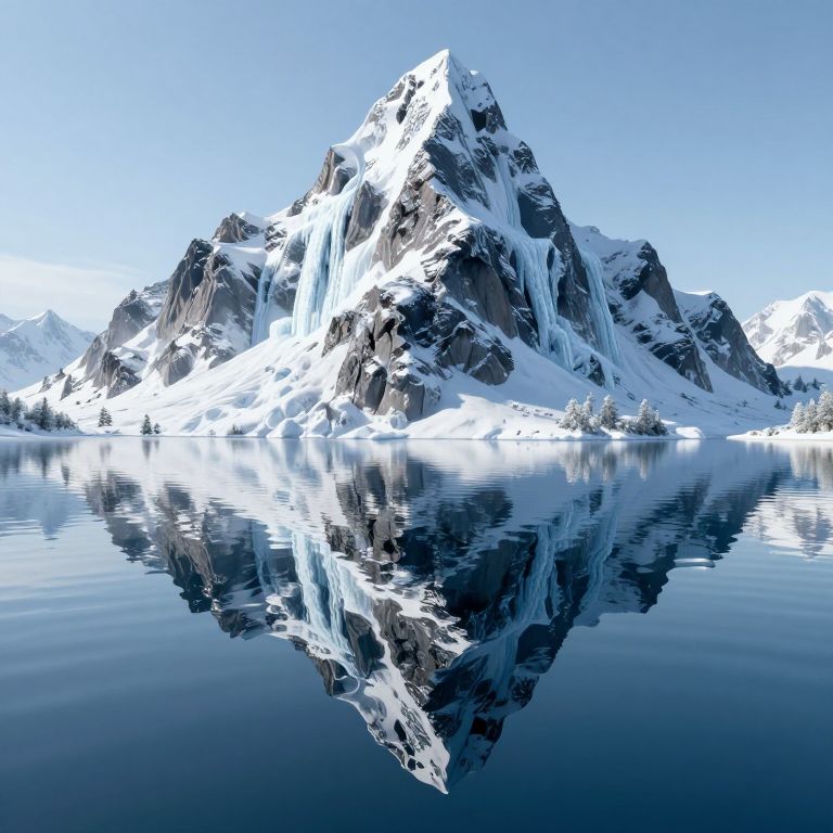 A surreal 3D-rendered landscape depicts a majestic mountain inverted into a serene lake, its summit submerged beneath the surface, adorned with frozen waterfalls that defy gravity, creating a mesmerizing mirror-like reflection above and below the waterline.