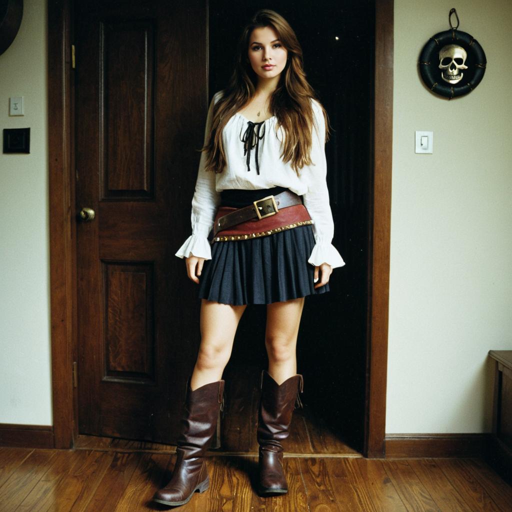 A young woman with long brown hair stands indoors against a wooden door. She is dressed in a pirate-themed outfit featuring a white blouse with flared sleeves, a short black pleated skirt, a wide brown belt with a large buckle and studs, and tall dark brown leather boots. The setting is a simple room with wood flooring and neutral walls, with a pirate-themed skull decoration hanging on the wall.