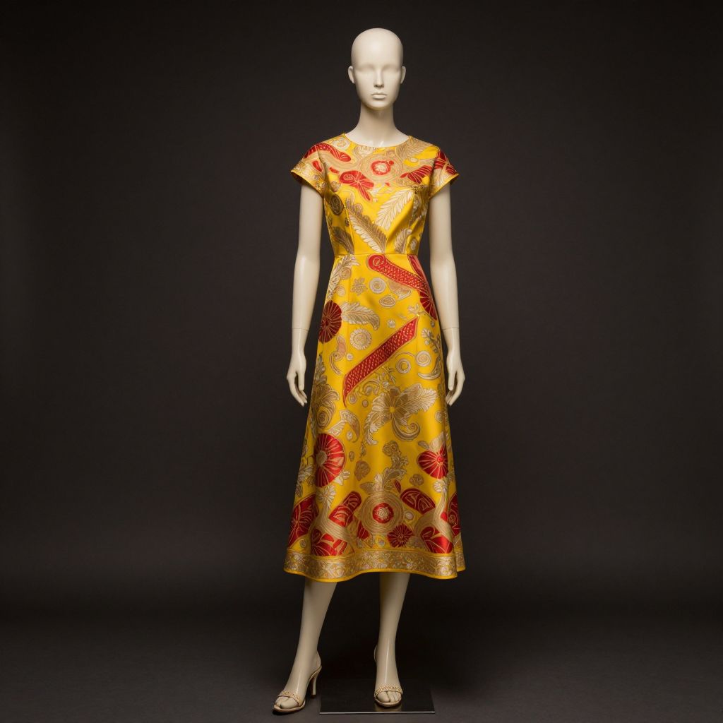 Mannequin wearing a yellow dress with a red and gold pattern on it, the mannequin is wearing a pair of sandals and has a serious expression on his face, the mannequin has a realistic and detailed appearance, with a flawless complexion, clear features, and an elegant posture, the dress is designed with a red and gold pattern that adds a touch of luxury and sophistication, the overall scene is stylized and artistic, capturing the essence of elegance and grace