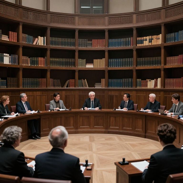 Photograph of a formal, wood-paneled, circular hearing room with eight middle-aged men in dark suits seated around a large, wooden table. The men, of varying ethnicities, have serious expressions and are holding papers or notebooks. Behind them, tall, curved bookshelves filled with colorful, leather-bound books line the walls. The room has a polished wooden floor, and a few observers are partially visible from behind, sitting in the foreground. The lighting is bright, highlighting the men and the bookshelves, creating a serious, formal atmosphere.