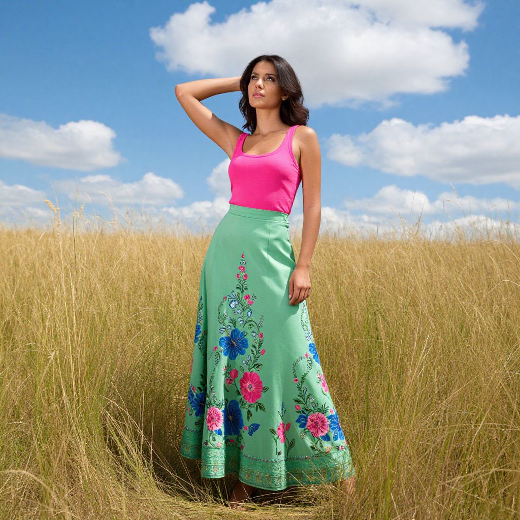 Woman standing gracefully amidst tall golden grass, wearing a vibrant pink tank top and a flowing green skirt adorned with blue and pink floral patterns, set against a backdrop of a bright blue sky dotted with fluffy white clouds.