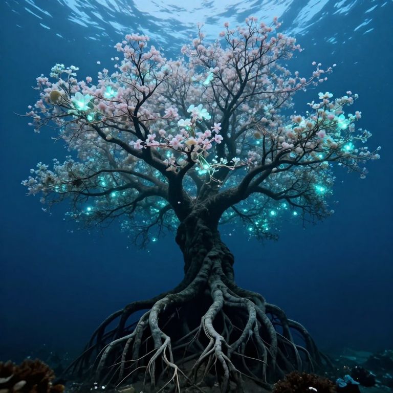 A hauntingly beautiful tree emerges from the ocean floor, its gnarled roots sprawling like branches above, while ethereal, bioluminescent blossoms cascade from its inverted canopy, illuminating the depths with a serene, otherworldly glow.