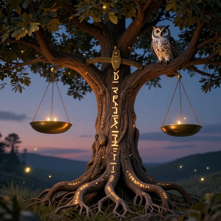 An artistic depiction of judgement as an ancient tree with branches forming scales of justice, roots intertwined with glowing runes, a wise old owl perched on a branch observing, twilight setting with glowing fireflies, conveying wisdom and impartiality.