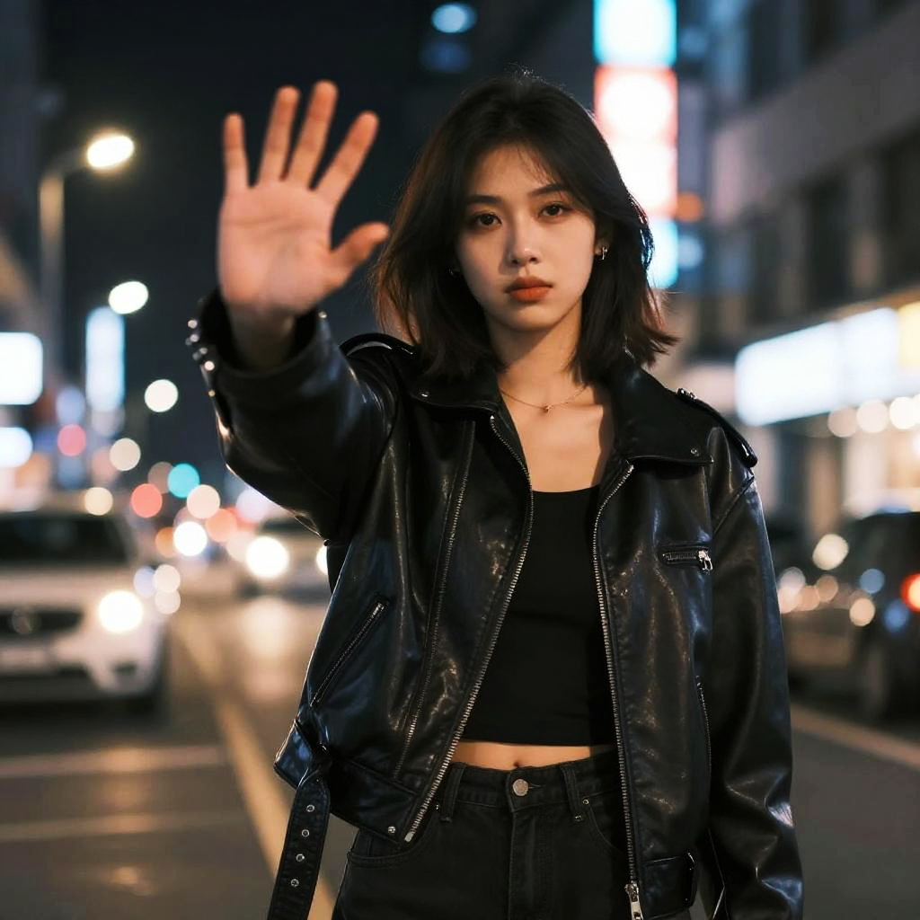 Photograph of an Asian woman with straight black hair, wearing a black leather jacket over a black crop top and high-waisted black pants, standing in a brightly lit urban street at night. She raises her right hand with fingers spread, palm facing the camera. The background features blurred neon signs, glowing lights, and parked cars, creating a bokeh effect. Her expression is serious, and the street's wet surface reflects the lights. The overall atmosphere is edgy and modern.
