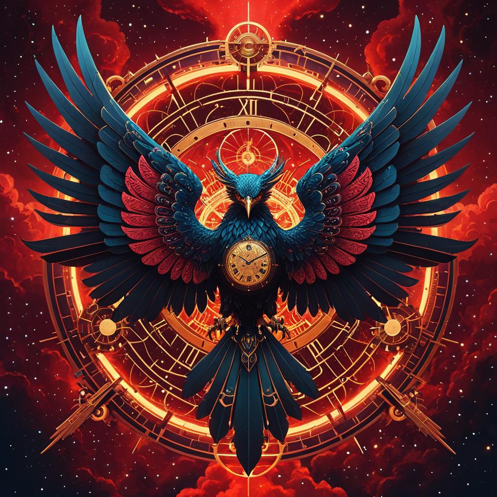 Digital illustration of a symmetrical clockwork phoenix with four wings, featuring intricate metallic filigree and luminous circuitry. The mechanical bird is centered on a large ornate clock face with roman numerals, set against a vivid crimson nebula sky with dark clouds. The artwork combines concept art and high-resolution digital painting techniques.