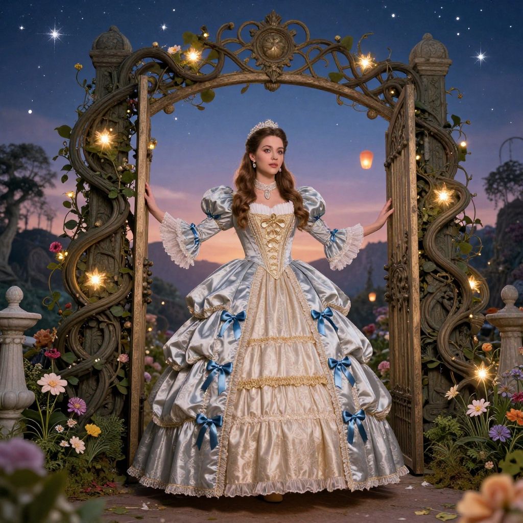 Photograph of a fair-skinned woman with curly brown hair adorned with a golden tiara, standing against a swirling, multicolored background. She wears a translucent, blue and white, Victorian-style dress with puffed sleeves and lace detailing. She holds up one hand gracefully and extends the other to lift the dress's skirt. The background is abstract with vibrant, psychedelic patterns, while the foreground shows a dark silhouette of an observer. The image has a dreamy, ethereal quality.