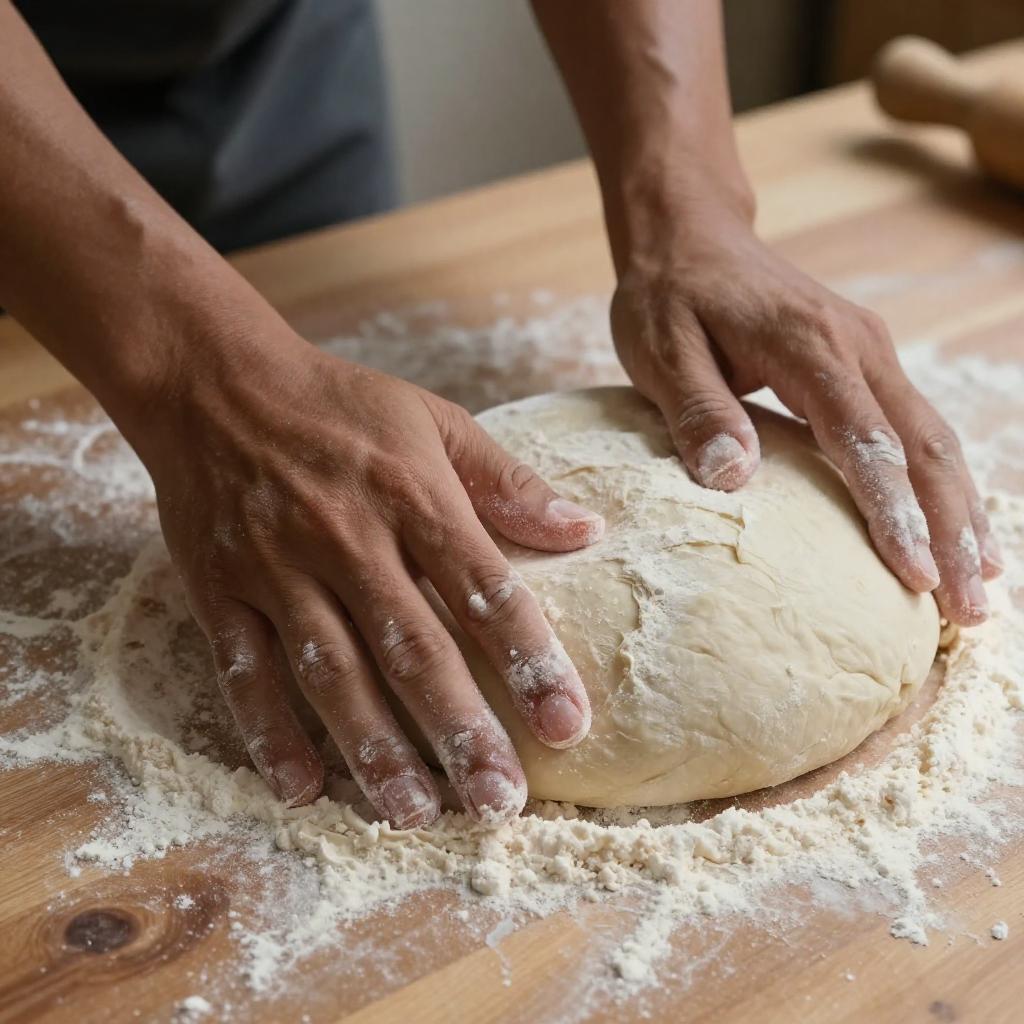 Photograph of a person's hands spreading dough on a baking tray. The person is wearing a white apron. In the foreground, there's a white ramekin with red sauce, a pile of grated cheese, three red tomatoes, and a wooden cutting board with a knife. The background is slightly blurred, focusing on the hands and dough. Bright, even lighting. Mid-shot, shallow depth of field.