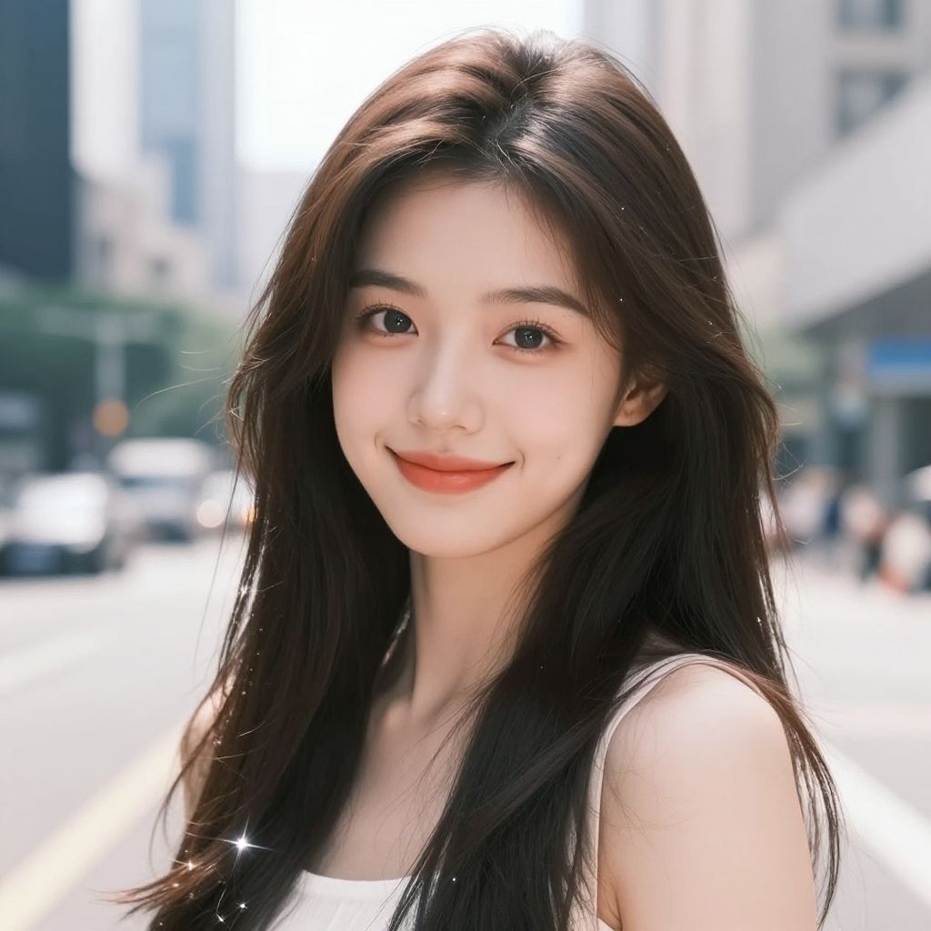 Photograph of an Asian woman with long, straight, dark brown hair and fair skin, smiling gently at the camera. She has delicate features, small nose, and dark brown eyes. She is wearing a white, sleeveless top and a simple necklace with a small pendant. The background shows a sunlit urban street with blurred yellow and white cars, and tall buildings. The sunlight casts a soft glow on her face, highlighting her natural beauty. The overall scene conveys a bright, sunny day in a bustling city.