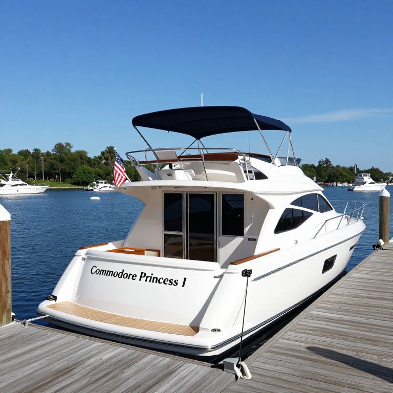 Photograph of a white, modern yacht named "Commodore Princess I" docked at a wooden pier. The yacht has a black canopy, a small American flag, and a ladder on the right side. The background shows calm blue water, other small boats, and green trees under a clear blue sky. The yacht's name is prominently displayed in black letters on the front.