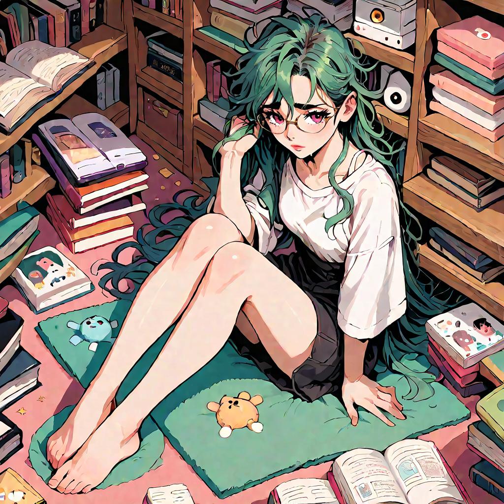 This digital anime-style illustration depicts a young woman with long, teal-green hair and glasses, sitting on a green rug in a cluttered bookshelf-filled room. She wears a white, loose-fitting shirt and black shorts, with her bare legs extended forward. Her right hand rests on her cheek while her left supports her weight on the rug. The background features wooden bookshelves with various books, some open, and a few plush toys, including a yellow duck. The room is dimly lit, creating a cozy, intimate atmosphere. The overall color palette includes muted greens, browns, and whites, with vibrant accents from the books and toys.