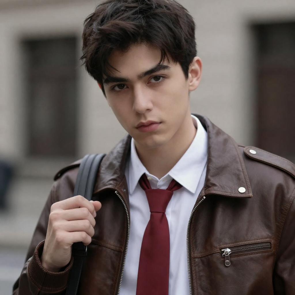 Young man with curly brown hair, light skin, wearing a white shirt and black strap, looking up with a slight smile. Dimly lit background, dark and indistinct. Right shoulder visible, left hand gripping strap. Casual pose.