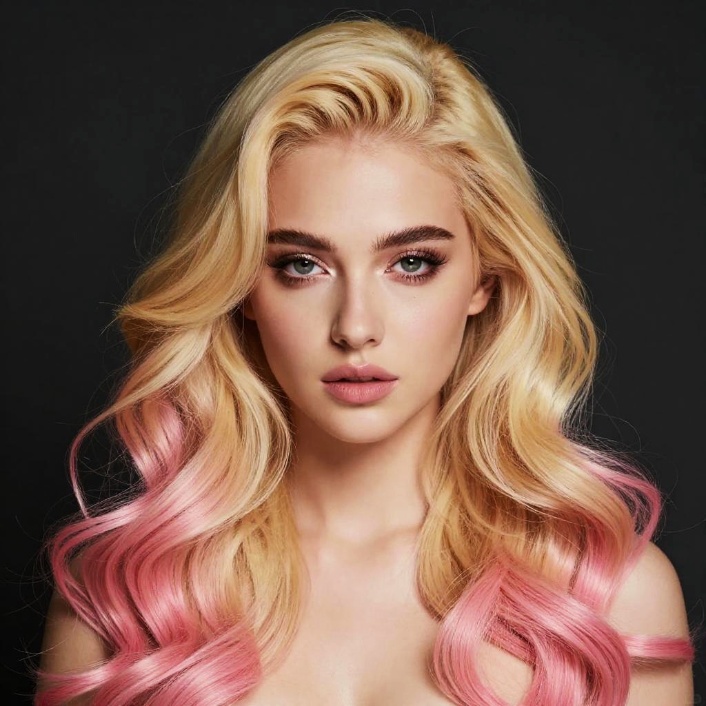 Blonde hair with pink tips styled in loose curls, studio portrait with dramatic lighting, high detail close-up, glossy finish, contemporary fashion magazine aesthetic