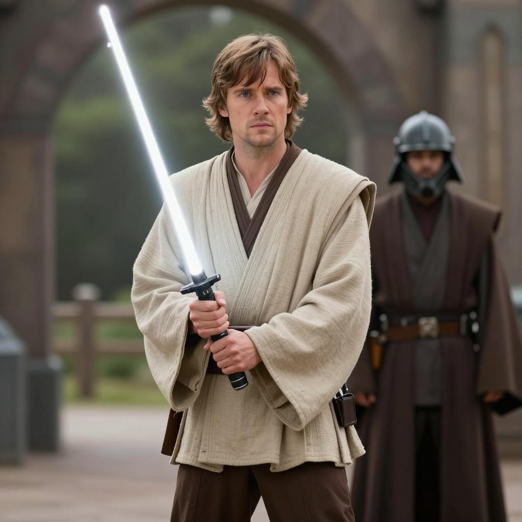 Man in Jedi Costume Holding Blaster