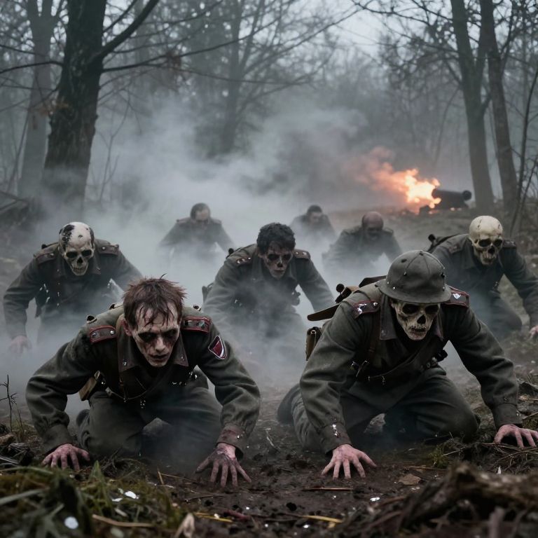 A group of zombie Russian soldiers WW1 wearing ragged early 20th-century military gear, crawling through a fog-covered forest with skeletal faces and torn insignias, eerie mist swirling around their twisted figures, and distant artillery fire illuminating the bleak horizon.