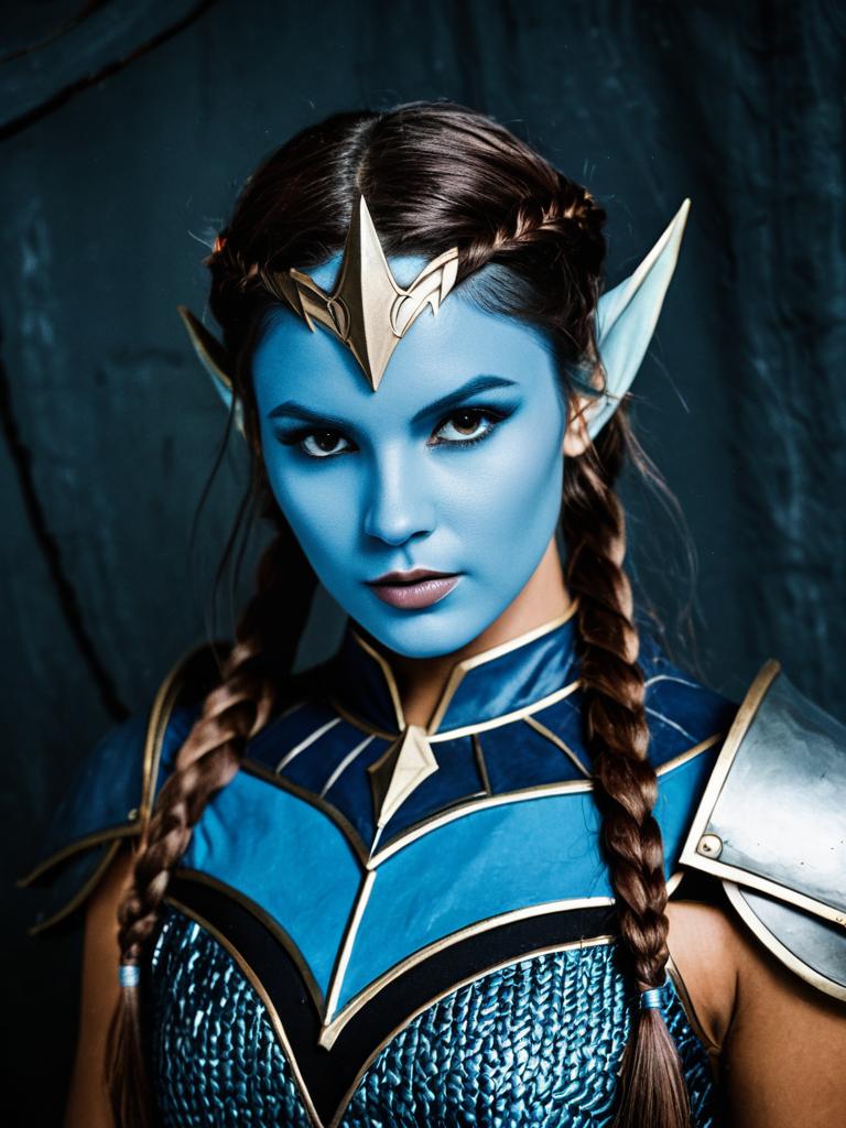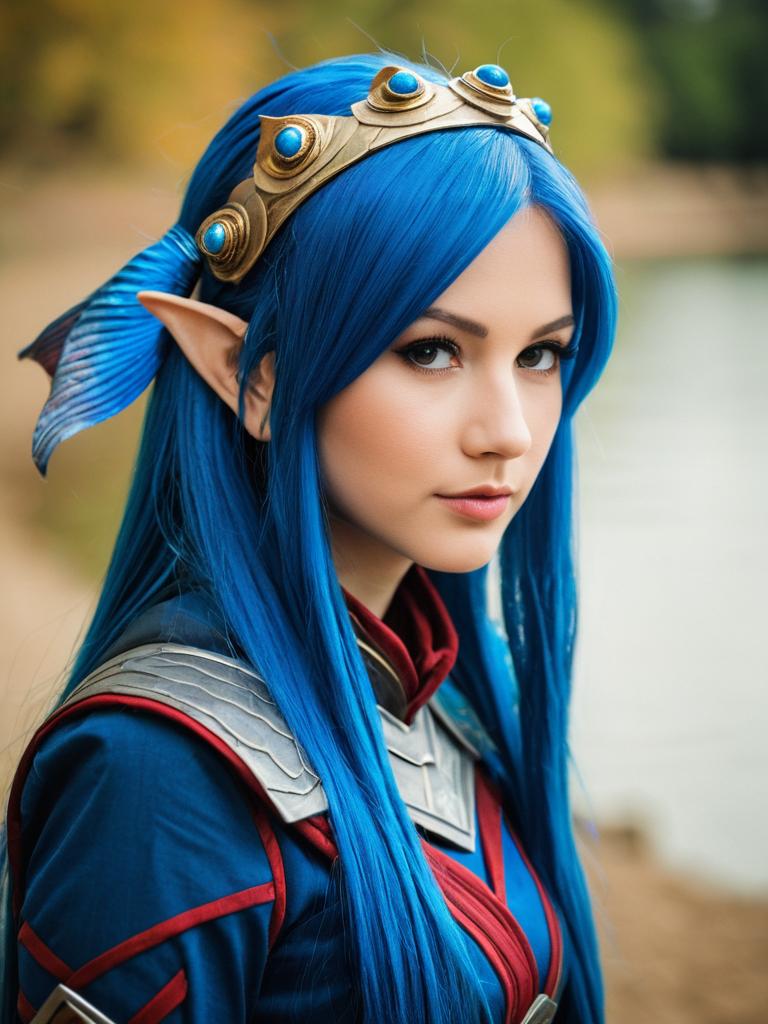 Photo-realistic cosplay photo of person in asari nanami costume. 1girl, blue eyes, blue hair, long hair, very long hair, fish hair ornament, hair ringslifestyle stock photo, shallow depth of field, lifestyle stock photography, shallow depth of field, natural lighting, warm tones, soft background blur, candid moments, vibrant colors, realistic textures, modern casual clothing. full body shot