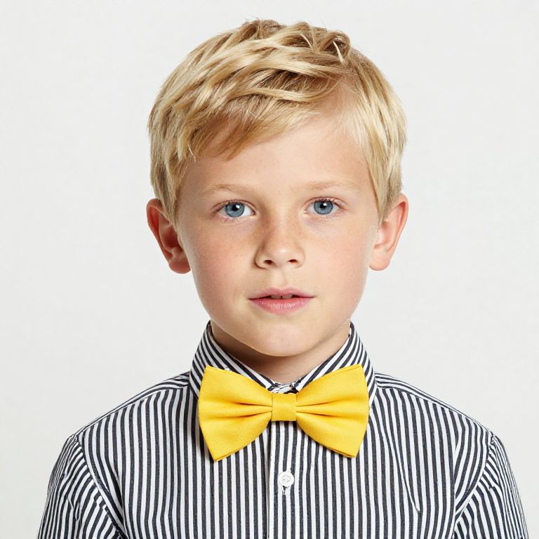 Boy with blonde hair and blue eyes wearing a black and white striped shirt with a yellow bow tie.
