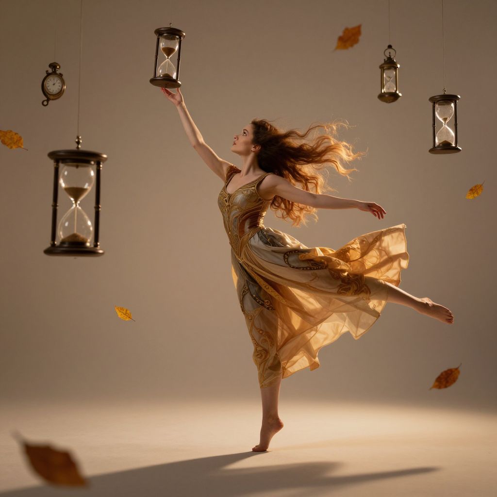 In this captivating scene, an ethereal woman with flowing hair balances gracefully on one leg, her attire adorned with intricate patterns reminiscent of golden artistry. She reaches towards a celestial hourglass suspended in mid-air, surrounded by floating timepieces of varying sizes that drift like autumn leaves against a surreal backdrop. The warm light bathes the scene, casting elongated shadows that enhance the dreamlike atmosphere and contribute to a sense of movement and depth, evoking feelings of both wonderment and contemplation.