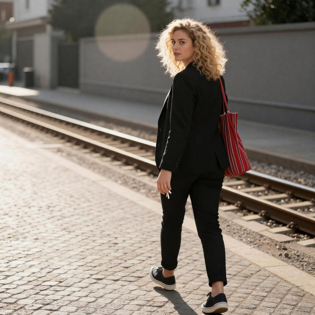 Woman with brown coat, jeans, and black boots standing in dark, concrete tunnel next to stationary train. She looks over her shoulder. Train has gray and red stripes. Arched tunnel with overhead lights. Nighttime. One person.