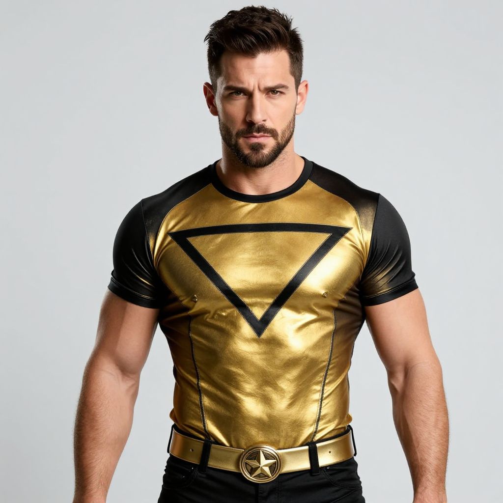 A photograph of a handsome, muscular man with short, dark brown hair and a trimmed beard. He's wearing a vibrant, metallic gold and black superhero t-shirt with a triangular design, and black pants with a gold belt featuring a star emblem. The background is a simple, light gray. He's standing confidently, looking directly at the camera with a serious expression.