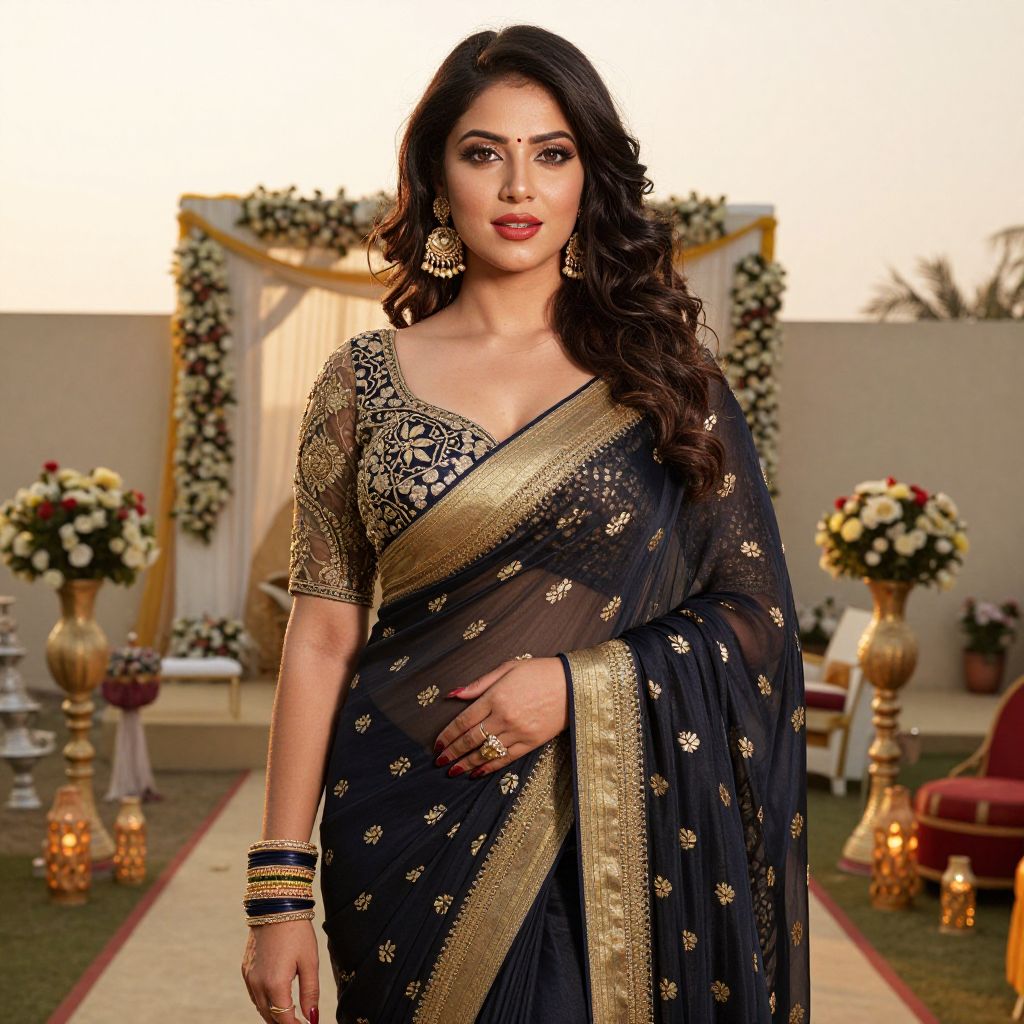 A stylish bridal woman with a flawless complexion, dark wavy hair, and a bright red lip, wearing an exquisite georgette saree with golden zari work, standing in a golden-hour setting at an outdoor wedding venue with flowers, lamps, and traditional decor in the background.. The woman has big tits and cute face