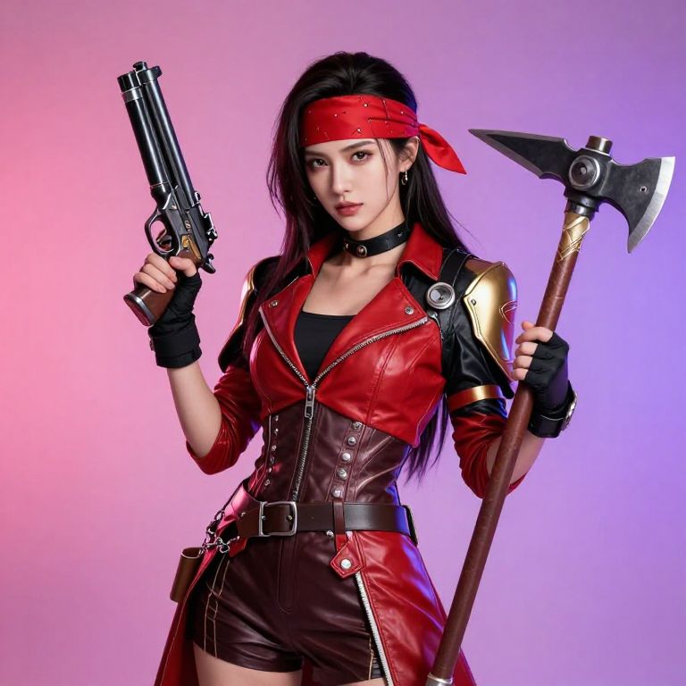 The image features a beautifully rendered character with a striking and detailed appearance. The character is adorned in a stylish, futuristic outfit that combines elements of armor and casual wear, with a red and gold color scheme that adds a vibrant touch. The character's hair is long and dark, styled in a sleek, flowing manner that complements the overall aesthetic. A red bandana is tied around the character's head, adding a touch of ruggedness to the look. The character is holding a gun in one hand, which is detailed with intricate designs and a metallic finish, while a pickaxe is held in the other hand, suggesting a blend of combat and mining skills. The background is a gradient of pink and purple hues, creating a dramatic and visually appealing backdrop that enhances the character's presence. The overall composition is balanced, with the character centrally positioned and the elements arranged in a way that draws the viewer's attention to the character's face and upper body. The interplay of colors, textures, and shapes creates a dynamic and engaging visual experience.